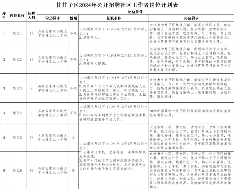 | 序号 | 岗位名称 | 招聘人数 | 学历要求 | 专业要求 | 工作地点 | | ---- | ------------ | -------- | ---------- | ---------- | -------- | | 1 | 社区网格员 | 50 | 大专及以上学历 | 社会工作、汉语言文学等 | 甘井子区各街道 | | 2 | 社区服务专员 | 30 | 本科及以上学历 | 社会工作、公共管理等相关专业 | 甘井子区各街道 | | 3 | 社区文化活动组织者 | 20 | 本科及以上学历 | 文化艺术、汉语言文学等相关专业 | 甘井子区各街道 | | 4 | 社区环境卫生管理员 | 15 | 大专及以上学历 | 环境科学、公共事业管理等相关专业 | 甘井子区各街道 | | 5 | 社区安全巡逻员 | 10 | 高中及以上学历 | 法律、公共安全等相关