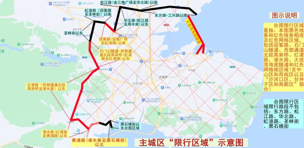 (1)主城区“限行区域”是指:东方路—工兴路以南、松江路(金 三角广场至华北路)以南、华北路(松江路至周水前)以东、迎客路(迎客广场至虹港路)以南(含迎客路)、虹港路(迎客路至圣林街)以南、圣林街—石门山隧道—西部通道北段高架桥以东(含石门山隧道、西部通道北段高架桥)、红凌路(西部通道北段高架桥至凌水路)以东(含红凌路)、凌水路(红凌路至黄浦路)以东(含凌水路)、黄浦路(凌水路至黑石礁街)以北、黑石礁街以东的合围区域(示意图附后)。