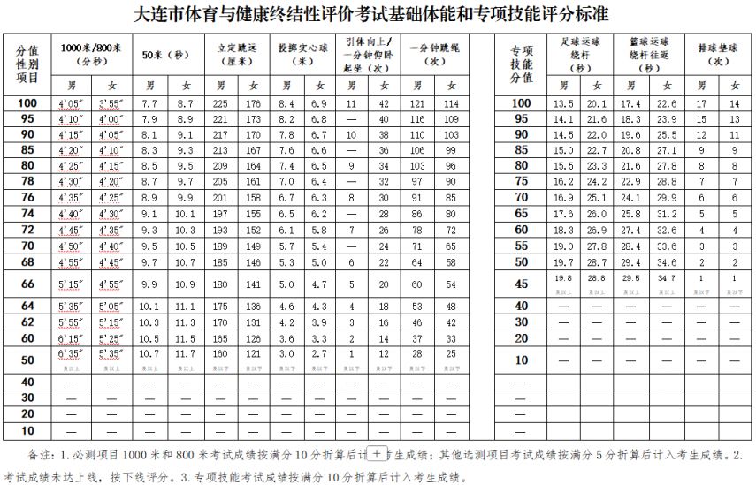 大连新中考体育考试项目及评分标准如下: