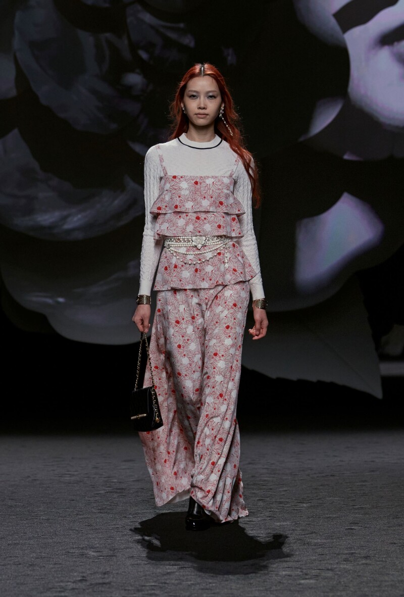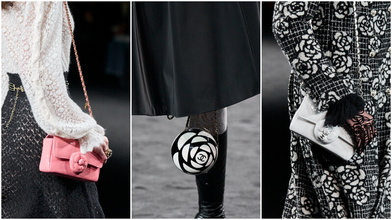 山茶花贯穿全系列维吉妮·维娅(Virginie Viard)这一季以Chanel最具标誌性的山茶花为主题,在秀场建构了多件大型山茶花装置,正场秀透过投影变换影像,衬上好听的音乐,幻化出多变且多彩的浪漫氛围。