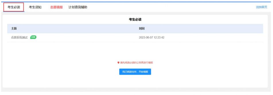 2)如果考生必读已经完成,则打开【志愿填报】页。