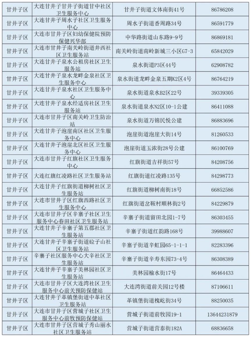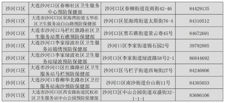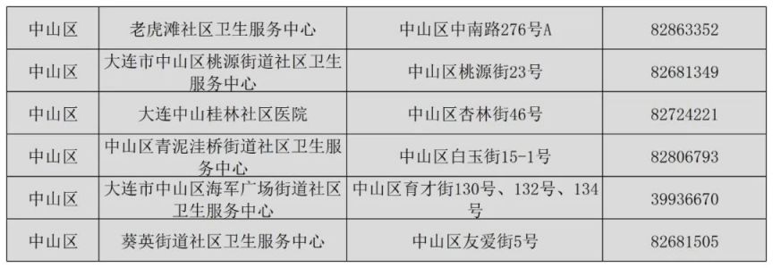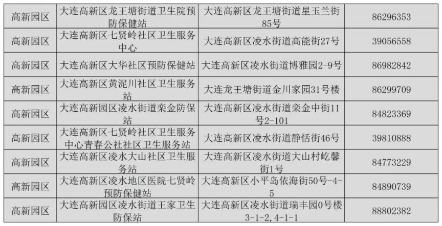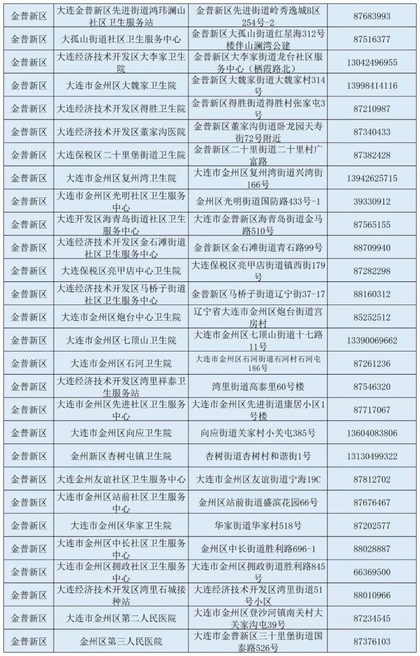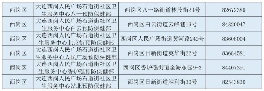 | 序号 | 疫苗接种点名称 | 地址 | 联系电话 | | ---- | --------------------- | ------------------------------ | ---------- | | 1 | 大连市XX区XX社区卫生服务中心 | 大连市XX区XX路XX号 | 0411-XXXXXXX | | 2 | 大连市XX区XX医院预防保健科 | 大连市XX区XX路XX号 | 0411-XXXXXXX | | 3 | 大连市XX区XX街道社区卫生服务中心 | 大连市XX区XX街道XX  举报 举报